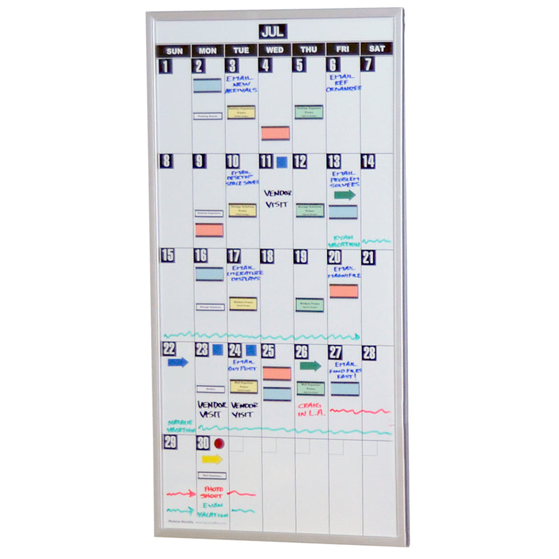 Individual ModMonthly Planning Boards are available if only one or two months is needed. Each board features an attractive aluminum frame and a smooth, magnetic steel surface for use with dry-erase marking pens and magnetic accessories. Daily cells measure 2 1/4"w x 6"h, ample room for even detailed entries. The smartly designed hanging rails (mounting hardware included) allow the boards to be easily removed and replaced. Each board measures 17 3/4"w x 34 3/4"h and weighs a mere 3 1/2 lbs.